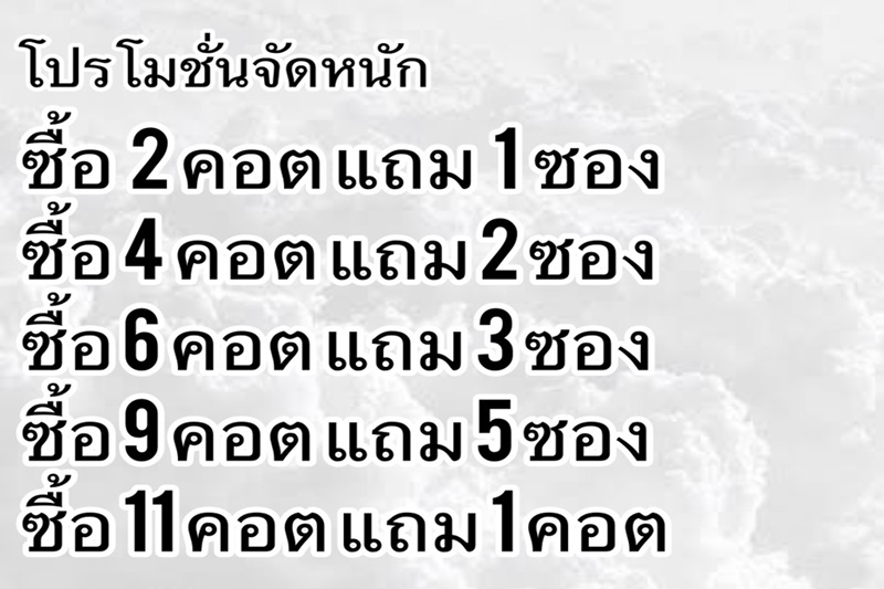 ซื้อ2 คอต แถม 1 ซอง4 คอต แถม 2 ซอง7 คอตแถม 5 ซอง10 คอต แถม 1 คอต